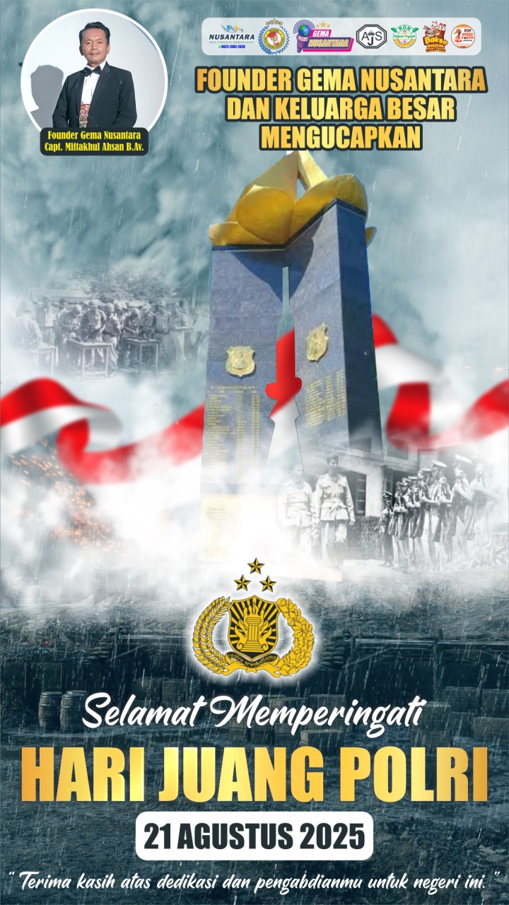 Founder Gema Nusantara Capt. Miftakhul Ahsan B.Av. Dan Keluarga Besar Mengucapkan Selamat Memperingati Hari Juang Polri, 21 Agustus 2025.
