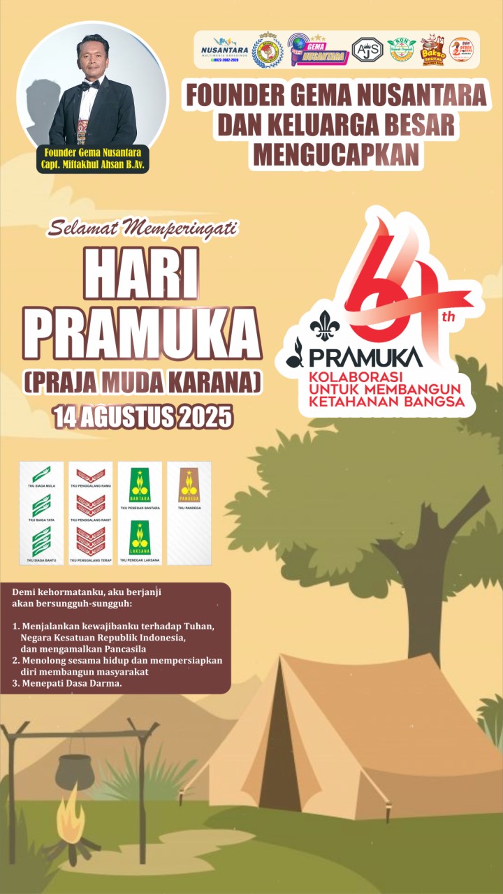 Founder Gema Nusantara Capt. Miftakhul Ahsan B.Av. Dan Keluarga Besar Mengucapkan Selamat Memperingati Hari Pramuka, 14 Agustus 2025.